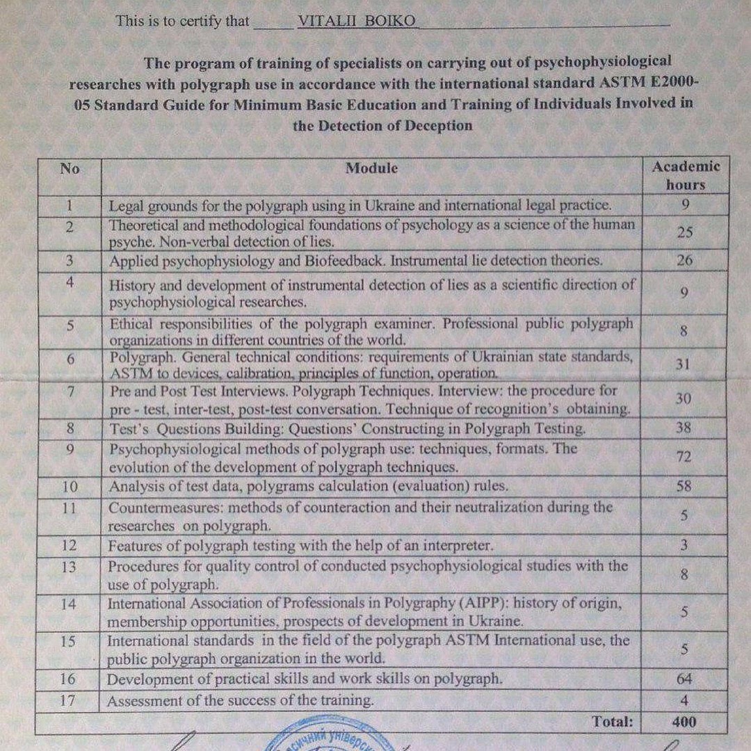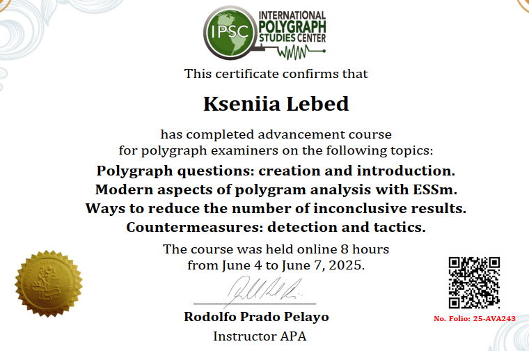 На нашу думку, це важливий аспект вибору поліграфолога. Одна з особливостей тестування з використанням російських методик – це тривалість тестування від 40 хвилин до 1 години. Тестування з використанням валідних методик неможливо провести якісно швидше ніж за 1,5 години. Зазвичай наше тестування триває близько 3 годин. Для нас важлива якість, тому ми готові витрачати для цього необхідну кількість годин.